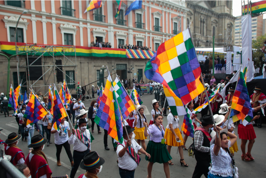 2020년 11월 8일, 볼리비아 라파스의 무리요 광장에서 루이스 아르세 볼리비아 대통령의 취임식 후 열린 시민 퍼레이드에서 사람들이 위팔라 깃발을 들고 있다. 출처: 원문 기사 Gaston Brito Miserocchi / Getty sImages