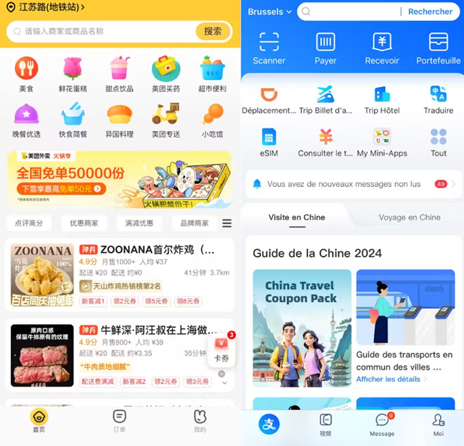 중국 애플리케이션 알리페이(오른쪽)와 메이투안(왼쪽)의 초기 화면. 출처: 작성자