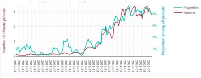 기후 및 환경 시위와 이에 대한 탄압을 세계적 관점에서 분석하기 위해, ‘무장 분쟁 지역 사건 데이터베이스’(Armed Conflicts Location Event database)를 사용했다. 2018년과 2019년 사이 기후 시위가 급격히 증가했으며이후로 감소하지 않았다. 2012년부터 2023년까지 1,000건 이상의 시위가 기록된 81개국에서기후 시위는 평균적으로 전체 시위의 약 4%를 차지했다이 데이터는 기후 시위가 점점 더 중요한 글로벌 현상이 되고 있음을 보여준다.