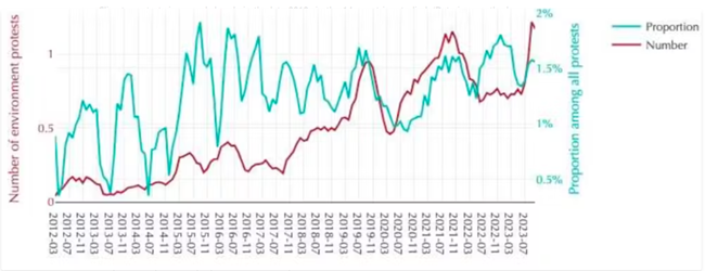 이 두 번째 그래프는 환경 시위가 더 점진적으로 증가했음을 보여준다.