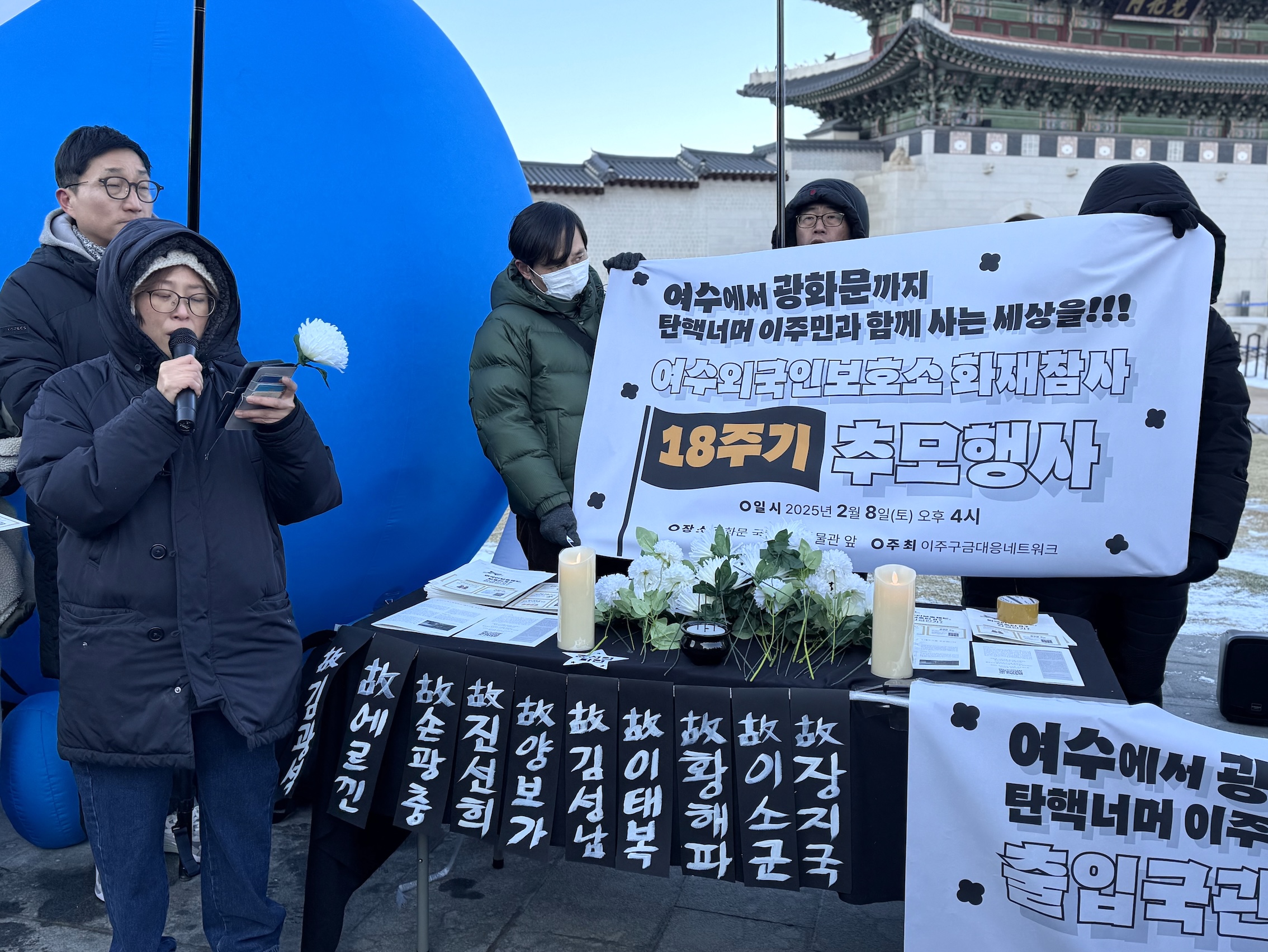 잔혹한 세계가 짓밟고 부순 이주민의 삶과 죽음을 기억하는 이들의 분투가 이어지고 있다. 지난 8일 오후 광화문 '퇴진 광장'에서는 '여수에서 광화문까지, 탄핵 너머 이주민과 함께 사는 세상을' 바라는 추모행사가 열렸다. 이주구금대응네트워크가 주최한 이날 행사는 여수외국인보호소 화재 참사 18주기를 함께 기억하고, 이주민의 존엄을 보장하기 위한 출입국관리법 개정을 촉구하는 자리였다.