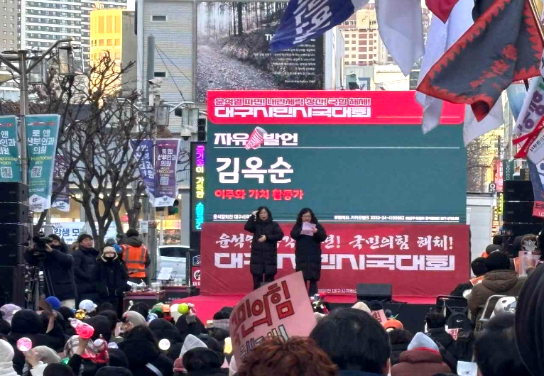 대구시민시국대회에서 발언하는 김옥순 활동가. 이주노동자인권·노동권 실현을 위한 대구경북지역연대회의