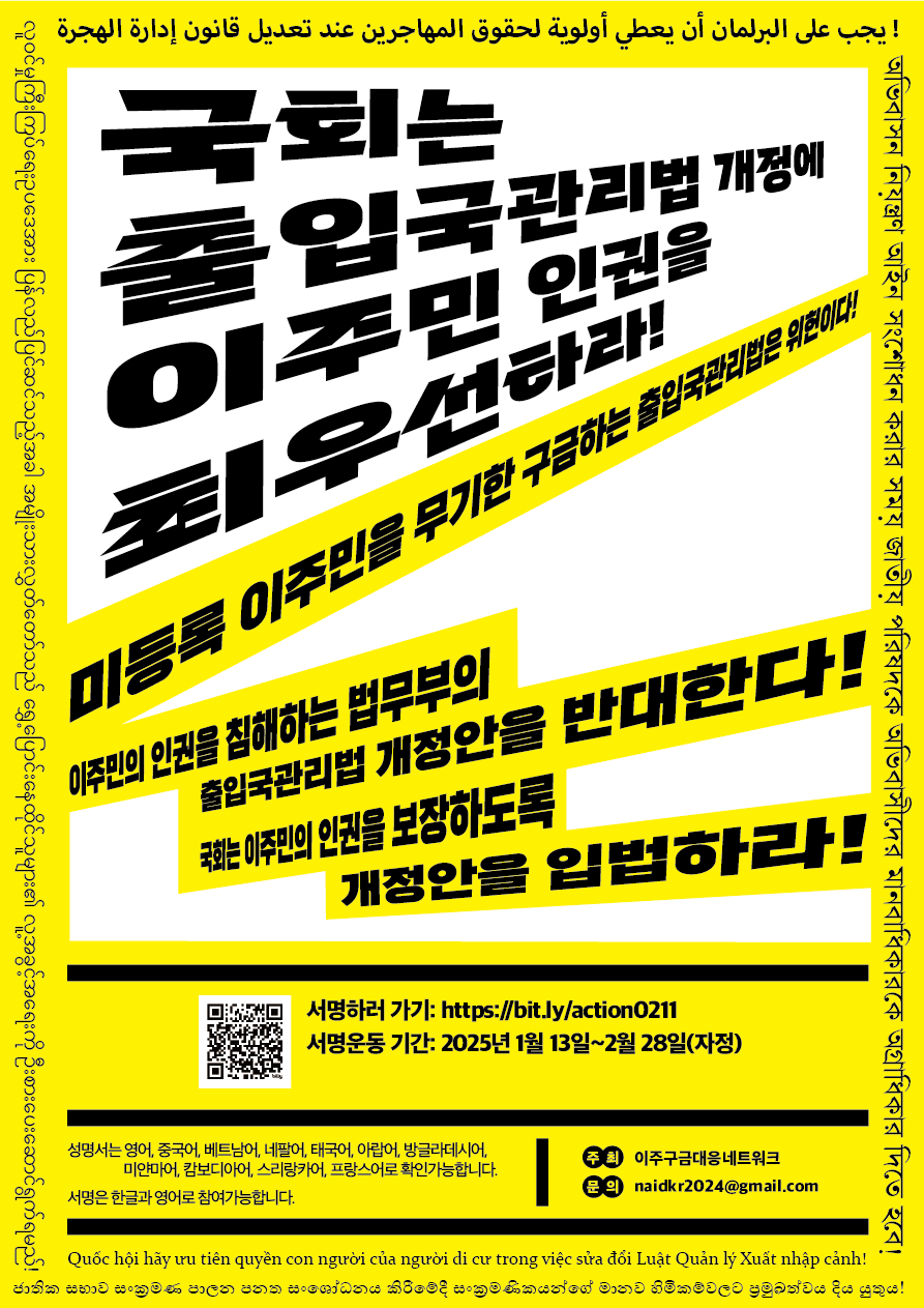 이주구금대응네트워크는 지난 1월부터 이주민 인권을 보장하는 출입국관리법 개정을 위해 서명을 받고 있다. 지난달 22일에는 1차로 취합된 1천 인의 서명을 국회 법제사법위원회 법안심사제1소위 소속 박범계, 박균택, 이성윤, 서영교, 박희상, 유상범, 장동혁, 주진우 의원실과 우원식 국회의장실에 전달하기도 했다. 서명을 받는 성명서는 11개 언어로 작성되어 다양한 언어를 사용하는 이주민 당사자들도 참여할 수 있도록 했다. 서명은 2월 28일 자정까지 온라인으로 함께할 수 있다. [출입국 관리법 개정 서명 참여하기]