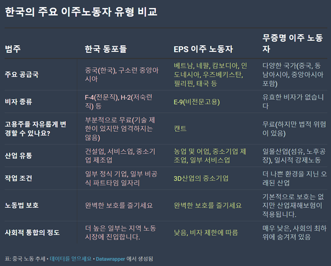 한국의 이주 노동자 유형별 인구를 보면 같은 흐름이 반복됨을 알 수 있다조선족 중국 노동자가 61만 명으로 가장 많고무등록 이주 노동자가 42만 명, EPS 노동자가 31만 명으로 가장 적다조선족 중국 노동자의 수가 가장 많은 이유는 문화적·언어적 친숙함 때문만이 아니라, ‘동포라는 신분으로 다양한 비자를 받을 수 있기 때문이다이들은 자유롭게 직장을 구할 수 있고근무지를 변경할 수 있으며단기 외주 및 파견 노동을 하는 것도 일반적이다반면무등록 이주 노동자는 EPS 노동자보다 더 유연하고 비공식적인 노동 형태를 보인다앞서 언급한 김()도 EPS 노동자에서 무등록 이주 노동자로 전환되면서 더 자유롭고 유연한’ 일자리를 얻었다.