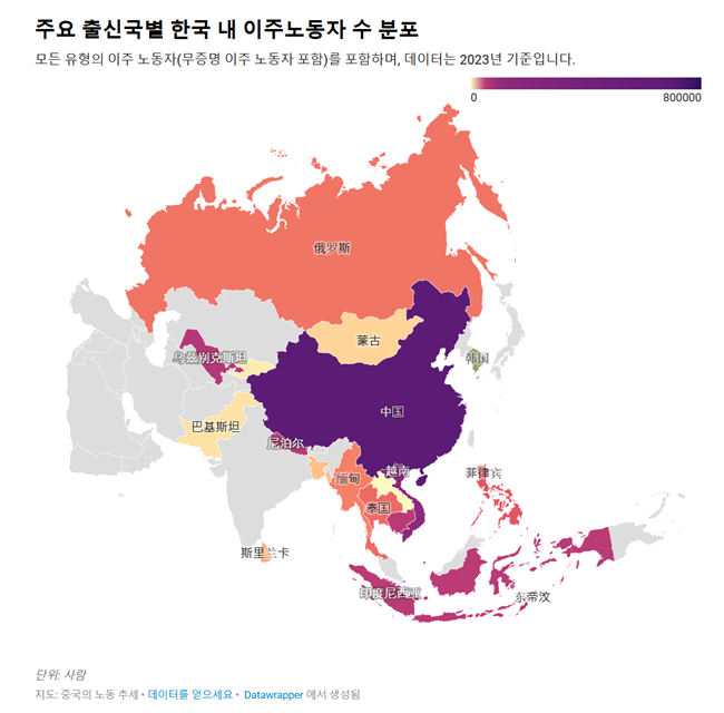 특히한국에서는 무등록 이주 노동자의 수가 합법적인 신분을 가진 이주 노동자보다 항상 많았다. 2023년 기준, EPS 노동자는 31만 명이었지만다양한 비자 경로를 통해 한국에 체류하는 무등록 이주 노동자는 이미 42만 명에 달했다이들 중 일부는 관광 비자로 한국에 입국한 후 체류 기한을 넘긴 경우이며또 다른 일부는 친척 방문을 명목으로 한국에 들어온 경우이다그리고 일부는 원래 EPS 노동자였지만직장에서 문제를 겪고 어쩔 수 없이 도망칠 수밖에 없었던 경우이다무등록 이주 노동자를 고용하는 공장은 비정규적인 소규모 작업장이거나심지어 정식 이주 노동자조차 감당할 수 없는 저성장 산업에 속한 경우가 많다.
