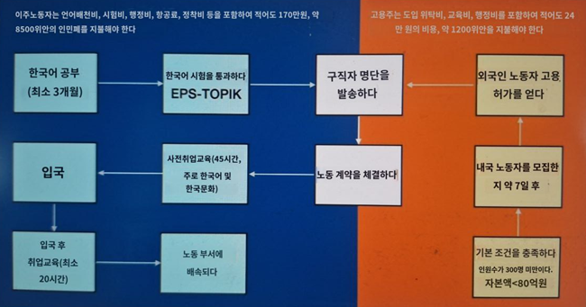 EPS 제도에서이주 노동자는 본국에서 일정 기간 학습을 거쳐야 하며한국어 능력 시험을 통과하고 한국 문화와 관련된 문제에 답해야만 한국에 올 수 있는 기본적인 자격을 얻는다또한한국 입국 전후로 수일간의 취업 교육 과정을 거쳐야 한다이 과정은 구체적인 직무 기술을 다루지 않으며대신 한국에 입국한 노동자가 "한국 생활에 적응하고", "한국 문화를 이해하도록하는 것을 목표로 한다고용주가 부담하는 비용에는 전체 신청 절차를 처리하는 데 필요한 행정 인력 비용과 이주 노동자가 한국에 입국한 후 부담해야 하는 각종 보험료(출국보증보험체불임금보증보험귀국비용보험상해보험비용이 포함되지 않는다이주 노동자가 부담하는 비용은 출신 국가에 따라 차이가 있으며여기서는 인도네시아를 예시로 든다.
