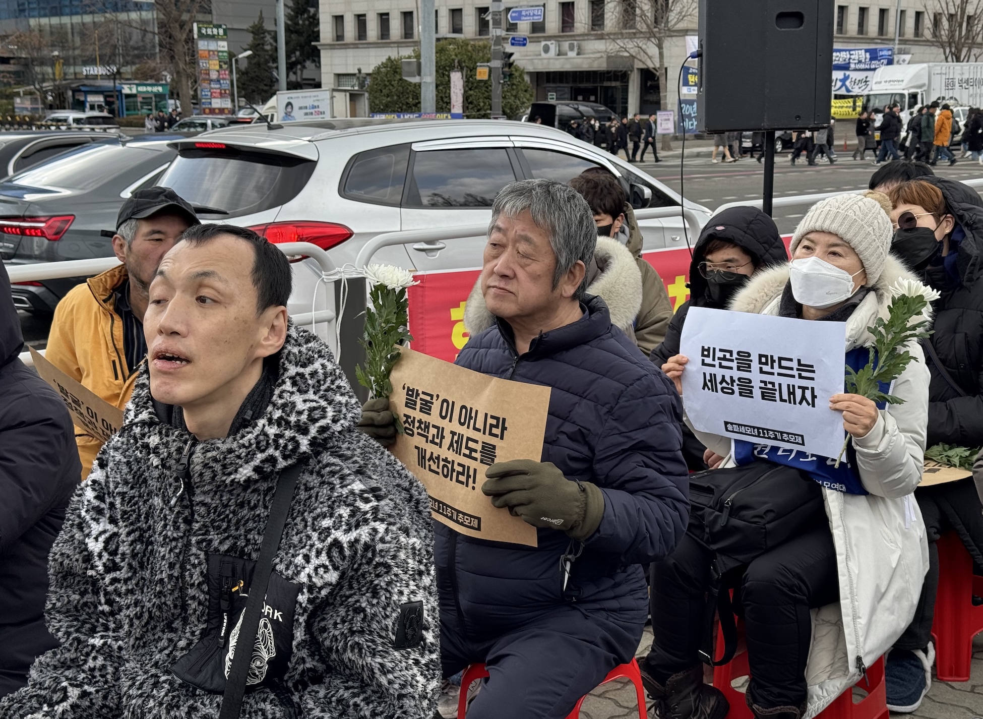 서울 송파구 반지하 방에서 살아가던 세 모녀가 세상을 떠난 지 11년이 흘렀다. 세 모녀는 유서와 함께, 월세・공과금 70만 원을 남기고 숨을 거두었다. 유서에는 "죄송합니다. 마지막 월세와 공과금입니다. 정말 죄송합니다.”라고 쓰여 있었다. 25일 국회 앞, 세 모녀의 삶과 죽음을 기억하는 이들이 모여들었다. 쪽방촌 주민, 장애인, 전세사기 피해자 등 사회적 안전망 바깥에서 생존의 위기를 맨몸으로 마주하는 시민들은 "가난은 죄송할 일이 아니다. 가난한 이들의 생존권을 보장하라"고 함께 외쳤다. 이들은 송파 세 모녀의 죽음 이후에도 빈곤과 차별로 인한 죽음들이 이어지고 있다면서 부양의무자 기준 등 기초생활보장제도의 개선을 촉구했다.