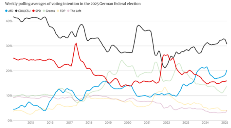 독일이 이번 일요일 조기 총선을 치르는 가운데현재 집권 연립 정부인 사회민주당(SPD), 녹색당자유민주당(FDP)이 큰 패배를 앞두고 있다주요 야당인 보수 성향의 기독교민주연합-기독교사회연합(CDU-CSU) 동맹은 지지율이 약 30%에 이르고 있으며, SPD는 지난 선거에서 26%를 기록했던 것과 달리 16%로 떨어졌다녹색당은 15%에서 13%로 하락했고, FDP는 연방의회(Bundestag) 의석을 확보하는 데 필요한 5%를 넘기지 못할 가능성이 크다.