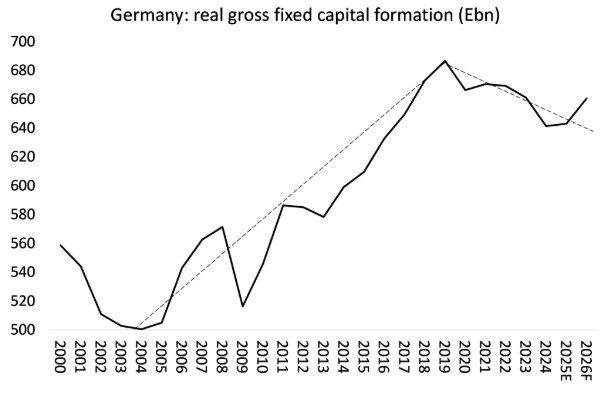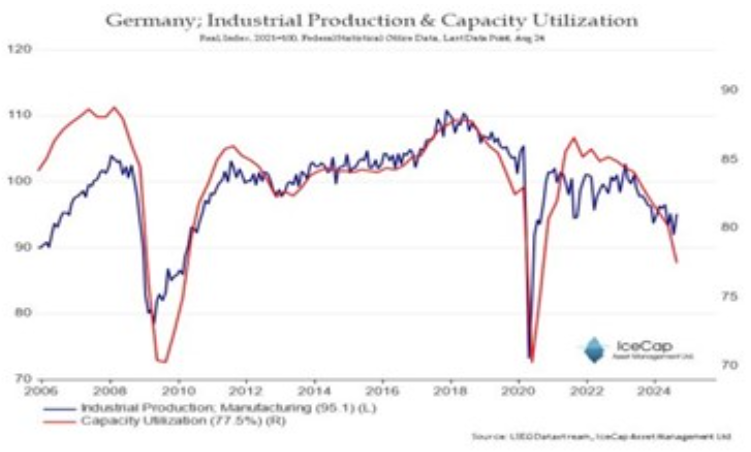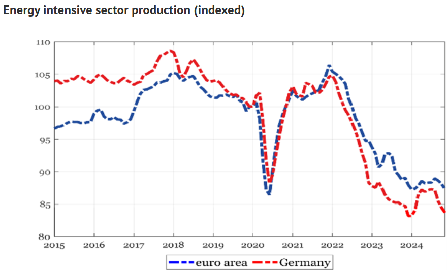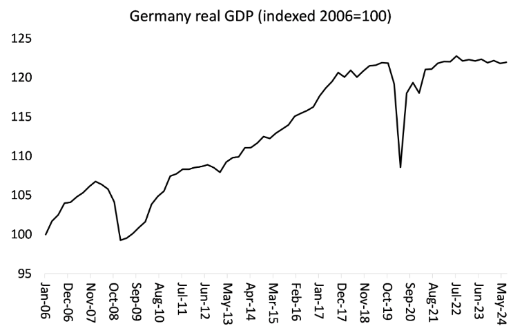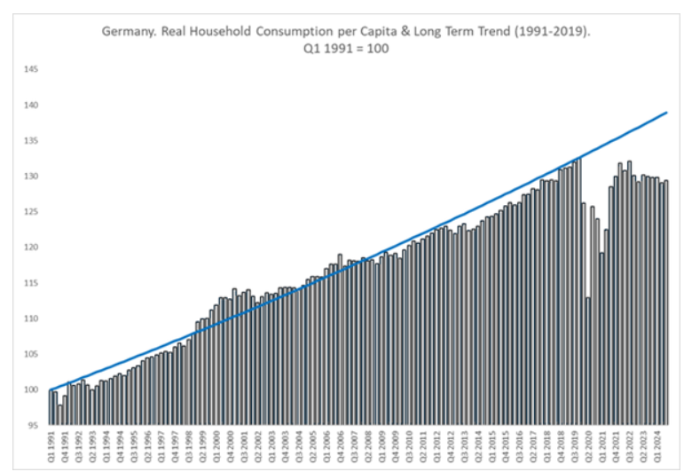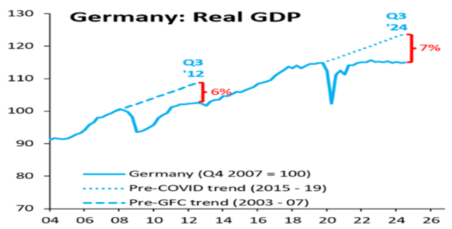 유럽의 대표적인 제조업 강국인 독일은 팬데믹 이후 사실상 멈춰 섰다독일의 실질 GDP는 지난 5년 동안 정체 상태에 머물렀다독일의 실질 기업 투자 감소 폭은 유로존 전체보다 훨씬 심각하며실질 가계 소비도 큰 타격을 입었다.