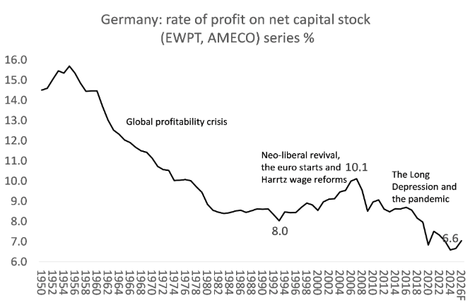 수익성은 글로벌 금융위기(Great Recession) 때부터 하락하기 시작했고, 2010년대 장기 침체 동안 계속 감소했다가장 큰 타격은 팬데믹 기간에 발생했으며현재 독일 자본의 수익성은 역사상 최저 수준에 이르렀다.