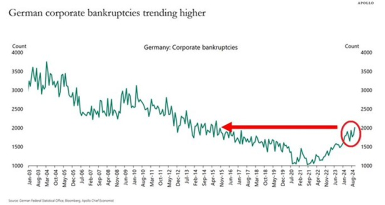독일 기업 파산 건수가 2,000건 증가하며 10년 만에 최고치를 기록했다지난 3년 동안 두 배로 늘어나 2024년 말에는 총 4,215건에 달했다.