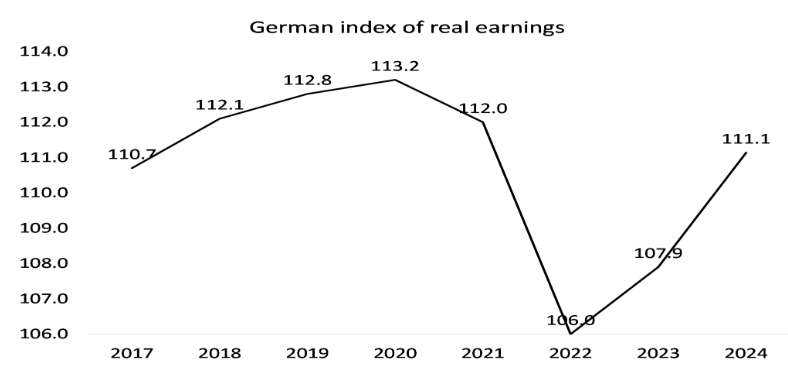 독일의 실질 임금은 여전히 팬데믹 이전 수준을 회복하지 못하고 있다독일경제연구소(German Economic Institute)가 가계 설문조사 데이터를 바탕으로 발표한 ‘2024년 분배 보고서’(Distribution Report 2024)에 따르면독일인의 4분의 1이 생계를 유지하기에 부족한 소득을 벌고 있다.