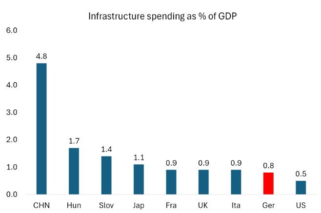 메르츠는 민간 투자를 유치해 경제를 정상화하겠다고 약속했다하지만 독일의 인프라 투자—철도다리 등—는 역대 최저 수준이다독일의 효율성을 상징하던 명성도 이제는 무색하다는 지적이 나온다열차는 제시간에 운행되지 않고인터넷과 모바일 통신망은 불안정하며도로와 다리는 곳곳에서 노후화가 심각하다. 2022년 독일 교통부 보고서에 따르면개보수가 필요한 다리가 4,000개에 달한다독일의 고정 초고속 인터넷망(광섬유 기반보급률도 11%에 불과해 OECD 국가 중 최하위권에 머물러 있다.
