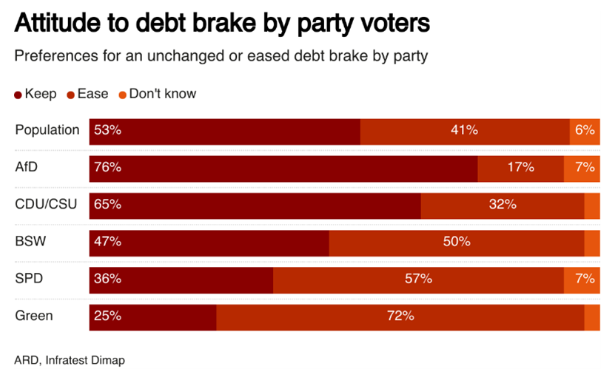 하지만 독일 헌법재판소는 이 규정을 폐지하려는 시도에 제동을 걸 가능성이 크다설령 부채 제한 완화 조치가 사법 심사를 통과한다고 해도그 폭이 미미하여 독일의 재정 운용 여력을 실질적으로 확대하기는 어려울 것으로 보인다게다가 CDU/CSU 지지자의 3분의 2, AfD 지지자의 4분의 3이 부채 제한 완화에 반대하고 있다.