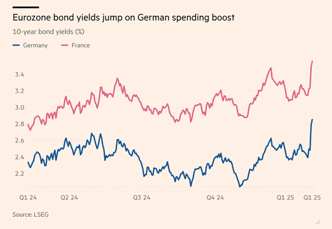 시장은 총 부채 규모가 최대 1조 유로에 이를 것으로 전망하고 있다독일 국채 시장이 즉각 반응했다글로벌 채권 시장에서는 예상보다 강한 반응이 나타났다.