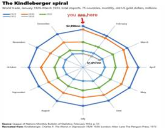 8. 다른 국가들의 보복 조치는 미국 수출의 감소로 이어진다. 1930년대 스무트-홀리(Smoot-Hawley) 관세 이후 보복 조치가 잇따르며 미국 수출은 33% 감소했고, ‘킨들버거 나선(Kindleberger Spiral)’이라 불리는 국제무역 붕괴의 악순환이 발생했다. 이 악순환은 관세가 무역을 감소시키고, 이에 대한 보복이 무역을 더 줄이며, 더 큰 보복 조치가 이어지고, 1차적으로 생산에 영향을 미친 뒤, 2차적으로 추가 관세와 보복으로 이어지며, 결국 전 세계 무역은 1929년 1월의 30억 달러에서 1933년 3월의 10억 달러로 축소되었다.
