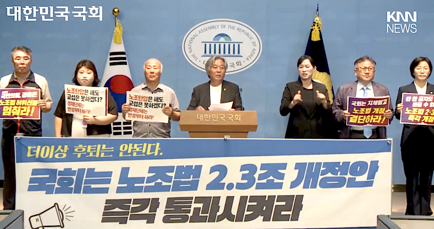 노조법 2·3조 개정안 즉각 통과 촉구 기자회견 현장.  KNN NEWS 유튜브 화면 갈무리