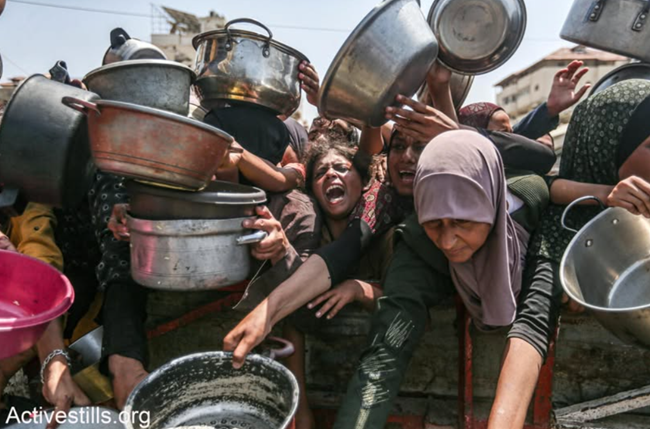 팔레스타인인들은 타는 듯한 햇볕 아래서, 이스라엘의 봉쇄로 인한 광범위한 기아 속에서 가자시티의 연대 부엌이 배급하는 음식을 받기 위해 기다리며 고통을 겪고 있다. 가자 보건부에 따르면 지난 24시간 동안 11명이 굶어 죽었다. 팔레스타인인들은 식량을 얻기 위해 GHF 배급소에서 목숨을 걸고 있으며, 이곳에서는 사람들이 일상적으로 공격당하고 살해되고 있다. 출처: 유세프 알-자눈/Activestills
