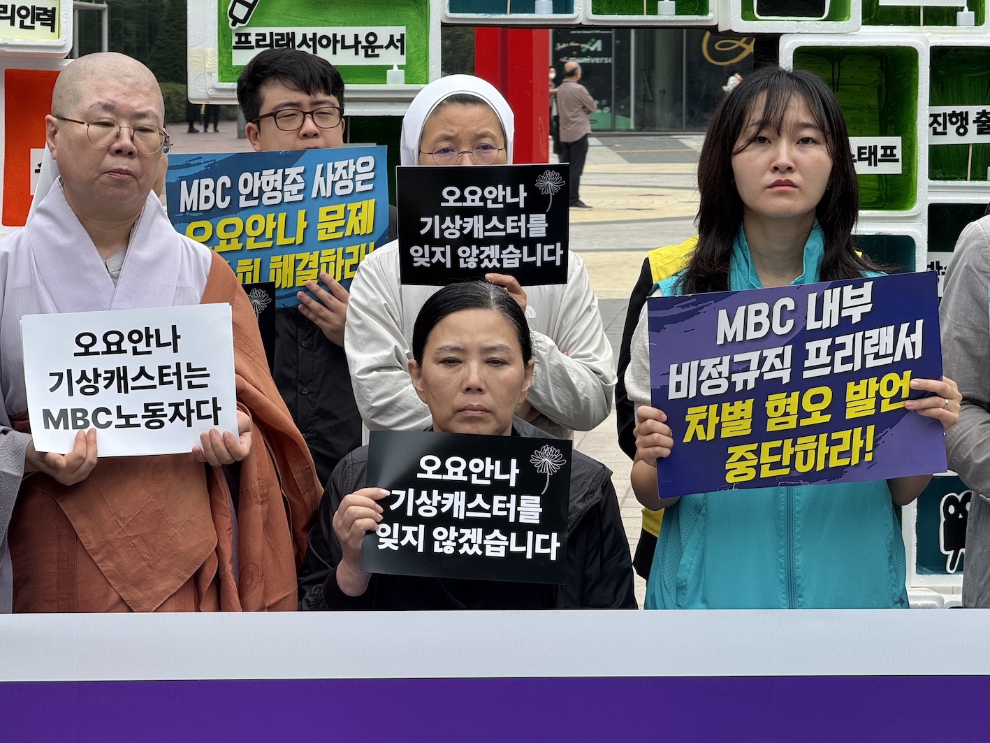 천주교여자수도회장상연합회JPIC분과 위원장인 여호수아 수녀는 “고 오요안나 님은 단지 개인적인 고통 때문에 세상을 떠난 것이 아니라, 비정규직이라는 이유로, 프리랜서라는 이유로 구조적 차별과 직장 내 괴롭힘을 견뎌야 했던 불합리한 현실이 그의 생명을 앗아갔다”면서 고인의 죽음 이후 “1년이 지난 지금까지도 책임을 회피하는 것이 과연 공영방송으로서 MBC가 보일 수 있는 태도인가” 지적했다.