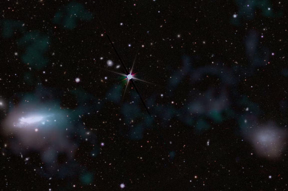 복합 이미지에는 두 왜소은하를 잇는 희미한 ‘가스 다리’가 나타나 있다. 출처: ICRAR, N. Deg, Legacy Surveys (D. Lang / 퍼리미터 연구소)