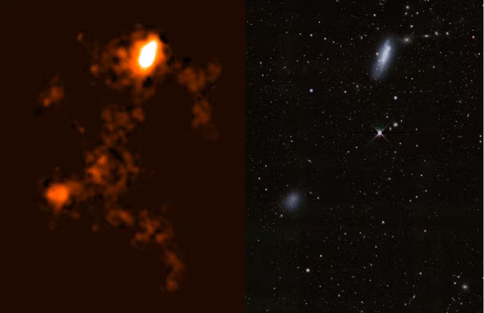 왼쪽: 은하 NGC 4532 / DDO 137 내부와 주변의 중성 수소 가스를 보여주는 전파 천문 이미지. 오른쪽: 해당 은하들의 광학 이미지. 출처: ICRAR, D. Lang (퍼리미터 연구소)