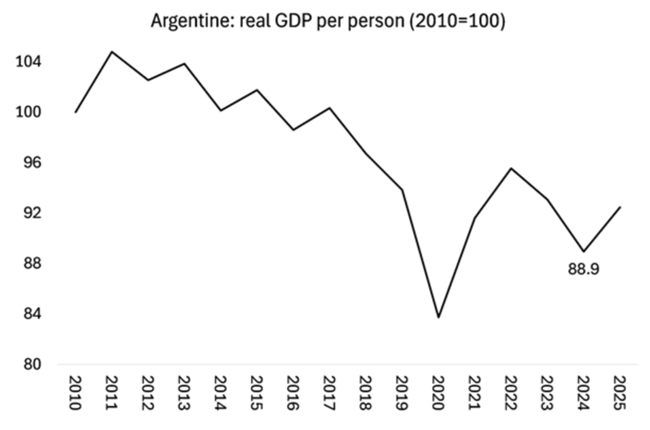 이것이 바로 아르헨티나 자본주의의 장기적 서사다. 경제는 사실상 2008~2009년 세계 대침체 이후, 특히 2012년 글로벌 원자재 가격 호황이 끝난 이후로 정체돼왔다. 2012년부터 2024년까지 13년 동안 실질 GDP의 평균 성장률은 고작 0.1%에 불과했다. 산업 생산은 감소하고 가계 소비는 정체돼 있으며, 소매 판매는 하락하고 있다. 이는 놀라운 일이 아니다. 공무원 임금이 실질 기준으로 33.8%나 하락했고, 아르헨티나 국민들이 생계를 위해 필사적으로 비공식 일자리를 찾아 나서고 있기 때문이다.