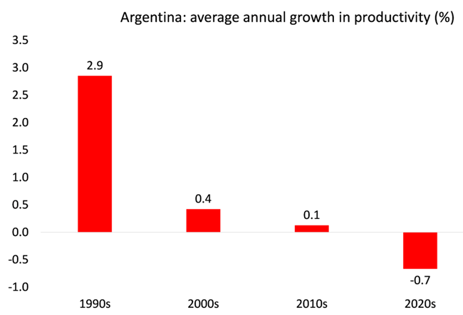 아르헨티나 마르크스주의 경제학자 롤란도 아스타리타(Rolando Astarita)가 지적했듯이, 아르헨티나의 근본적 약점은 기술적·생산적 후진성에 있다. 바카 무에르타(Vaca Muerta) 지역의 에너지나 대두·옥수수 산업처럼 아르헨티나가 천연 자원에서 비교우위를 가진 일부 부문을 제외하면, 생산성 수준은 국제 기준에 비해 매우 낮다. 심지어 대두, 밀, 옥수수 부문에서도 생산성은 미국 생산자보다 낮다. 이러한 차이는 본질적으로 투입재와 기술 수준에 대한 투자 격차에서 비롯된다.