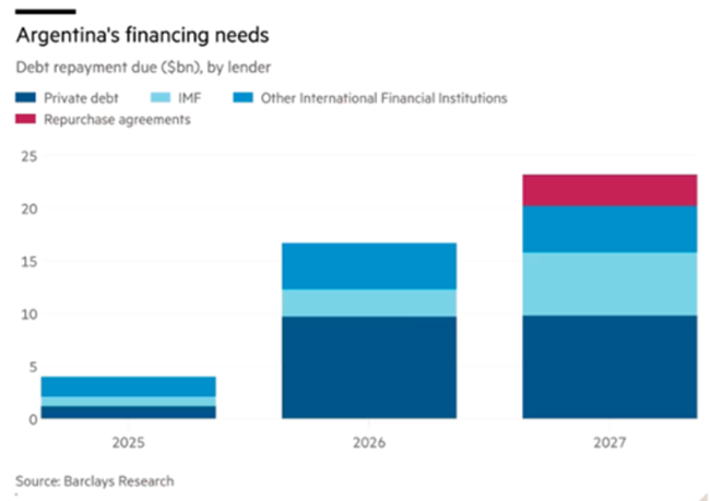 2026년 9월부터 민간 채권자들에게 상환해야 할 대규모 외화 부채 서비스 의무가 도래한다. 바클레이스(Barclays)에 따르면, 아르헨티나는 60억 달러의 순보유액에 불과한 반면, 950억 달러 규모의 달러 및 유로 표시 부채를 보유하고 있다. 그리고 이제부터 2027년 하비에르 밀레이(Javier Milei) 임기 종료까지 440억 달러에 달하는 부채를 상환해야 한다. 따라서 밀레이는 귀중한 외환보유액을 페소 방어에 사용할 여력이 거의 없다.