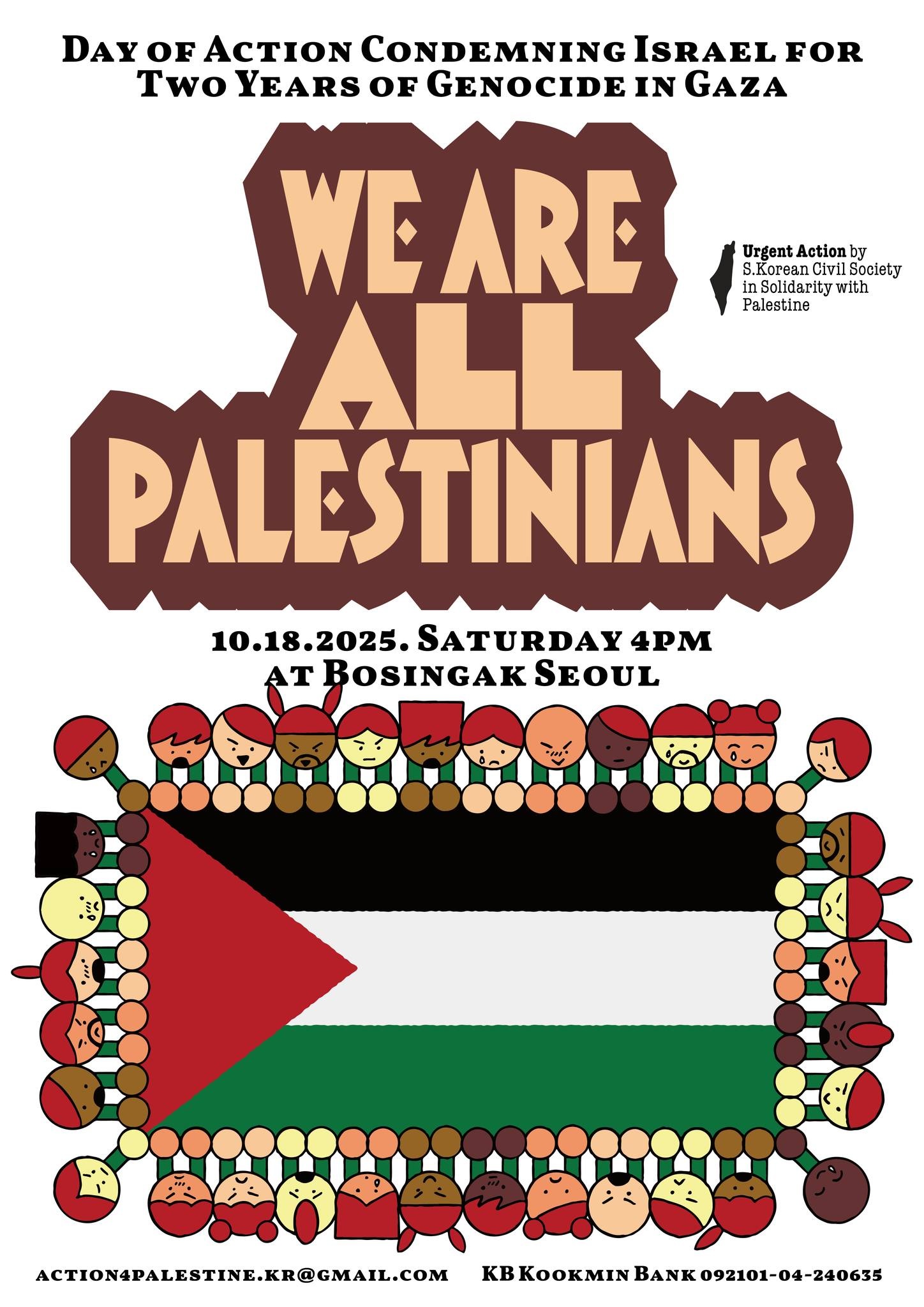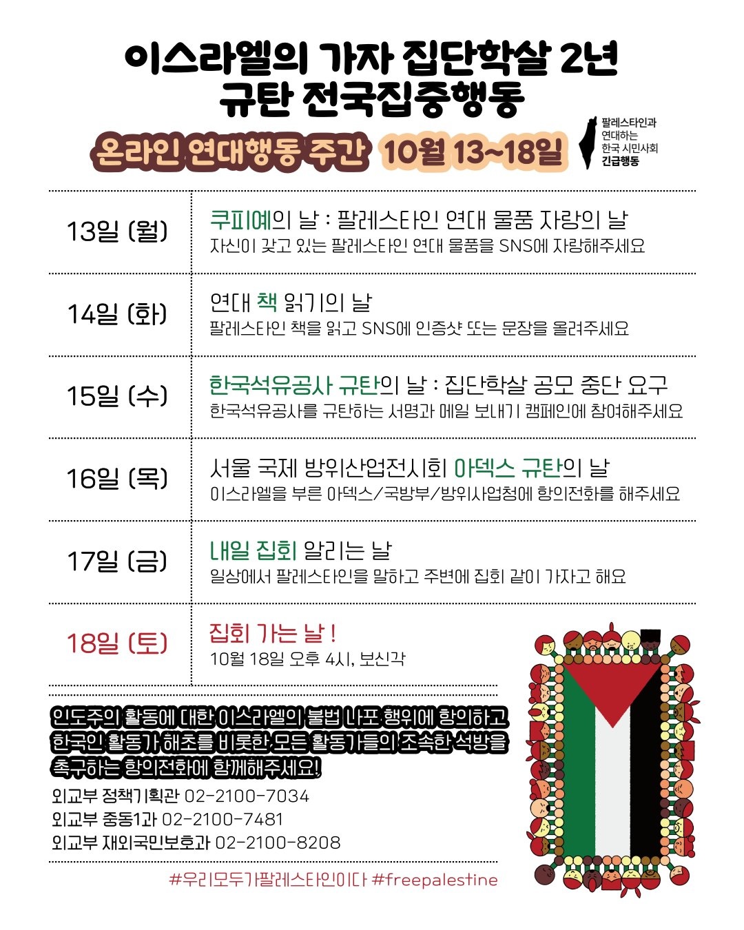 팔레스타인과 연대하는 한국 시민사회 긴급행동(이하 ‘긴급행동’)은 오는 10월 18일 오후 4시 보신각에서 “우리 모두가 팔레스타인이다”라는 슬로건을 내걸고 “이스라엘의 가자집단학살 2년 규탄 전국집중행동”을 계획하고 있다. 또한 지난 13일부터 전국집중행동일인 18일까지를 “온라인 연대행동 주간”으로 삼고 다양한 온라인 캠페인을 이어간다. 13일과 14일은 “팔레스타인 연대 물품 자랑의 날”, “연대 책 읽기의 날”을 진행했고, 15일에는 이스라엘로부터 팔레스타인 해역 가스전 탐사권을 구매한 다국적 기업 ‘다나 패트롤리엄’의 지분 100%를 소유한 한국석유공사에 집단학살 공모 중단을 요구하는 온라인 행동을 벌였다. 16일에는 이스라엘 군수업체의 서울 국제 항공우주 및 방위산업 전시회(ADEX) 참여와 팔레스타인 집단학살에 동조하는 군수산업을 규탄하는 연대 활동을 벌인다.