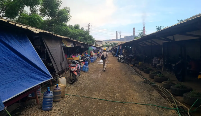 인도네시아 말루쿠 북부의 웨다베이 산업 단지 입구 근처, 중국인과 인도네시아 노동자들이 자주 찾는 상가 거리