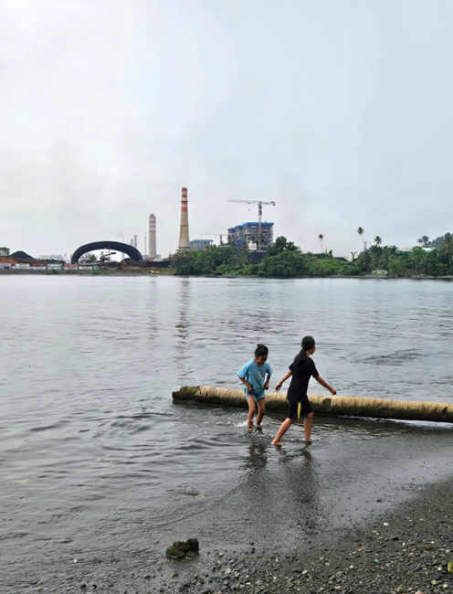 웨다만 해안에서 아이들이 놀고 있고, 그 뒤편에는 산업단지 내 니켈 공정을 지원하는 자체 석탄화력발전소가 보인다.