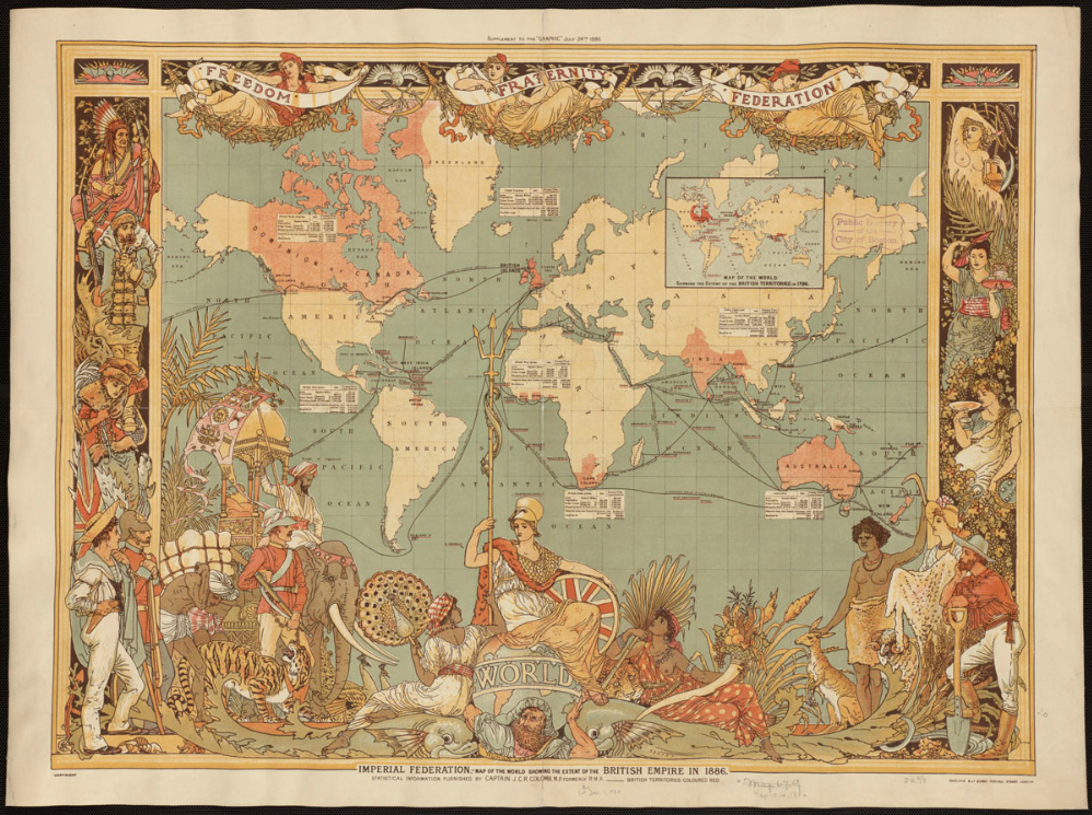 1886년 당시 대영제국의 영역을 보여주는 세계 지도보스턴 공공도서관 노먼 B. 출처레벤탈 지도·교육센터(Norman B. Leventhal Map & Education Center). Wikimedia Commons, CC BY