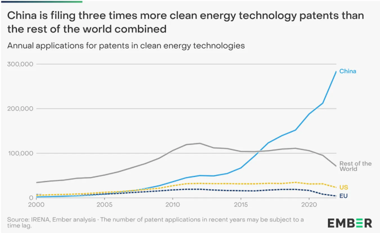 분명히 해두자. 과잉 공급은 오히려 긍정적인 일이다. 우리의 모델은 어디까지나 대략적인 추정치일 뿐이다. 태양광 생산 능력이 많을수록 청정 에너지 확대 비용이 적어진다. 속도가 느린 다른 재생에너지(예: 풍력)에 대한 부담을 줄여주고, 에너지 절약을 위해 비용이 많이 드는 복잡한 시도를 하지 않아도 된다. 이는 에너지 집약적 혁신을 유도할 가능성도 크다. 이미 중국은 전 세계를 합친 것보다 세 배나 많은 청정에너지 특허를 출원하고 있다.