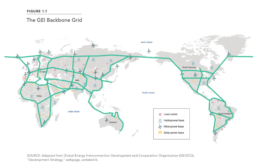 국영 전력회사인 국가전망공사(State Grid)는 대륙 규모의 대규모 전력망 연결 구상을 품고 있다. 미국의 RAND 연구소 같은 기관도 이미 2015년 시진핑이 ‘세계 에너지 상호연결(Global Energy Interconnection)’ 프로젝트를 지지했다는 점에 주목했다.