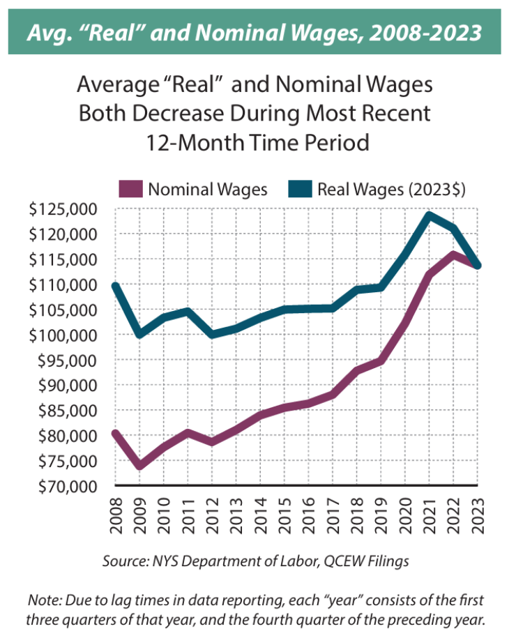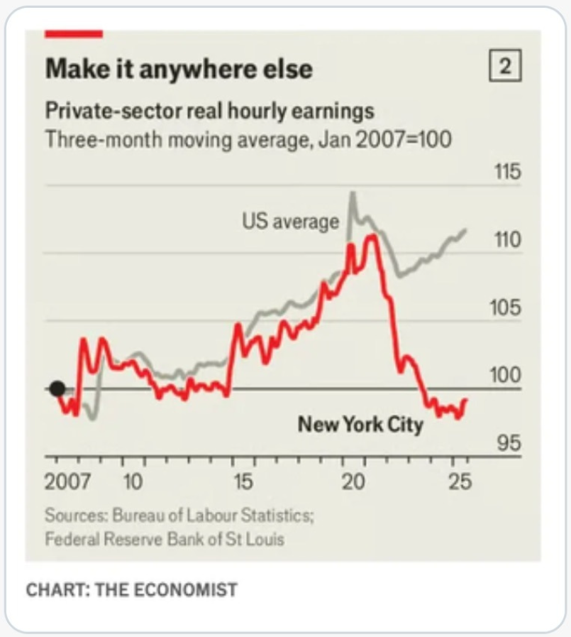 《이코노미스트(The Economist)》는 민간 부문의 실질 시간당 임금 변화 그래프를 통해 이 상황을 극적으로 보여주었다. 이 그래프에서는 뉴욕시의 실질 임금이 미국의 다른 지역과 비교해 약 15포인트나 하락한 모습을 보여주었다.