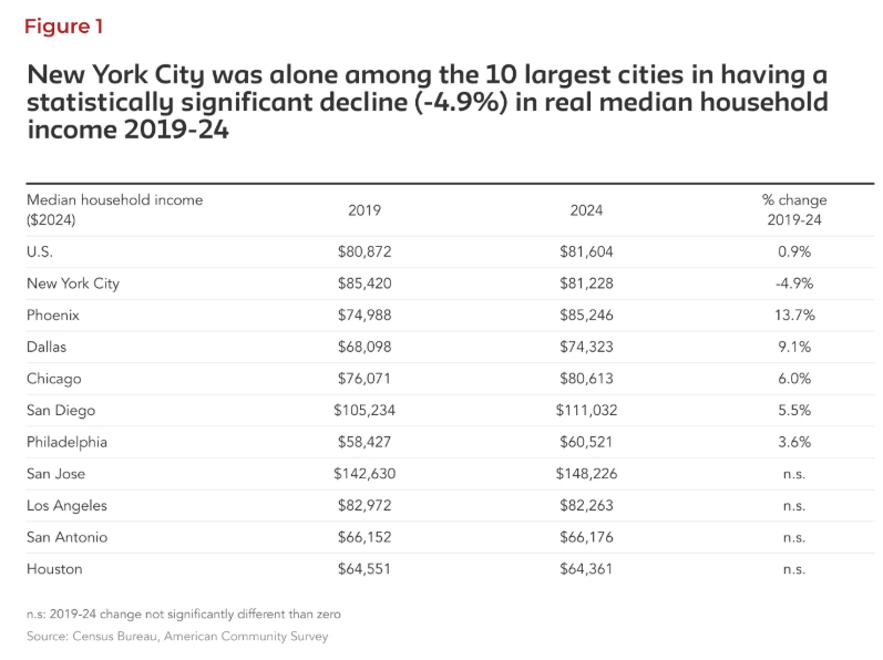 뉴욕시정문제연구소(Center for New York City Affairs)의 제임스 A. 패럿(James A. Parrott)이 작성한 도시 개발 비교 데이터는 뉴욕시가 2019년부터 2024년 사이 실질 중위 가계소득이 뚜렷하게 감소한 미국 내 유일한 도시임을 보여준다.