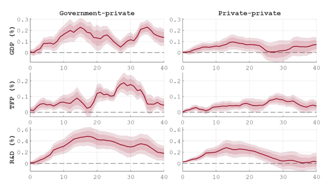 결과는 매우 인상적이다그림 1은 혁신의 거시경제 효과를 보여주는데공공–민간 특허(첫 번째 열)가 산출(첫 번째 행)과 생산성(두 번째 행모두에서 가장 큰 중기 효과를 보이며같은 기간 민간 부문 혁신(두 번째 열)의 효과를 두 배로 상회함을 보여준다정부가 자금을 지원했지만 민간이 소유한 특허는 민간 R&D 지출기업 투자실질 임금의 지속적 증가와도 연관된다공공–민간 특허는 전체의 2%에 불과하지만 중기 GDP와 TFP 변동의 약 5분의 1을 설명한다(그림 2). 여기서 보여주지 않은 공공–공공 특허를 통한 혁신은 평균 효과가 작지만 건강·생명공학 분야에서 가장 파괴적 돌파구를 비중 있게 포함한다이러한 결과는 열 가지 서로 다른 계량경제학 접근에서 모두 일관되게 나타나며정부가 자금을 지원하는 연구가 중기 생산성 향상의 핵심 동력임을 가리킨다.