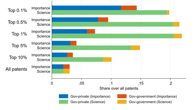 정부 자금으로 지원된 특허가 이렇게 큰 영향을 미치는 이유는 무엇인가그 특허가 민간 자금으로 지원된 특허보다 더 기초적 성격을 띠기 때문이다기초 연구는 지식의 프런티어를 확장하고광범위하게 적용 가능한 통찰을 생산해 강력한 파급 효과를 만들며 경제 전반의 혁신을 증폭시킨다그림 3은 정부 자금으로 지원된 특허가 가장 기초적인’ 특허에서 큰 비중을 차지함을 보여주는데이는 후속 특허와의 유사성(‘중요성’)과 과학 논문 인용 횟수(‘과학 의존도’)에 기반한 기초성 지표에 따른 것이다비록 수는 훨씬 적지만정부 자금이 지원된 특허는 민간 특허보다 훨씬 더 기초적 성향을 띠는 경향이 있다.