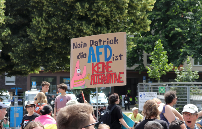 2024년 6월 28일, 독일 서부 에센에서 극우 정당 독일을 위한 대안(AfD)의 전당대회 개최에 반대하는 시위가 열렸고, 이 자리에서 참가자들은 “나치 반대! AfD 반대!”라고 구호를 외쳤다. 출처: Unsplash. Julia Taubitz