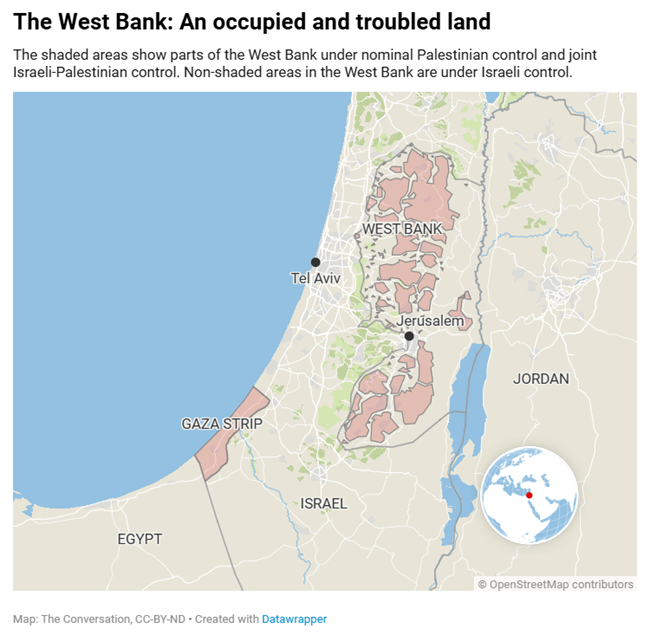 음영으로 표시된 지역은 명목상 팔레스타인 통제 지역과 이스라엘–팔레스타인 공동 통제 지역을 나타낸다. 서안지구에서 음영 표시가 없는 지역은 이스라엘의 통제하에 있다.