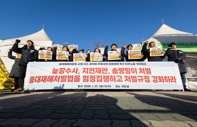 중대재해처벌법 시행 4년을 맞아 민주노총이 법의 엄정 집행과 처벌 강화를 촉구하며 전국 동시다발 기자회견을 열었다민주노총은 중대재해 발생과 사망자 수가 줄지 않는 현실은 솜방망이 처벌과 미흡한 법 집행 때문이라고 지적했다.