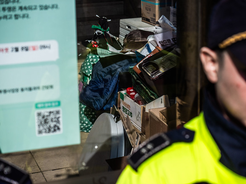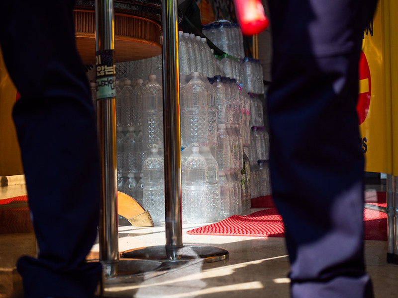 경찰의 다리 사이로 농성장에 있던 음용수가 쌓여 있다. 참세상 박도형 기자.