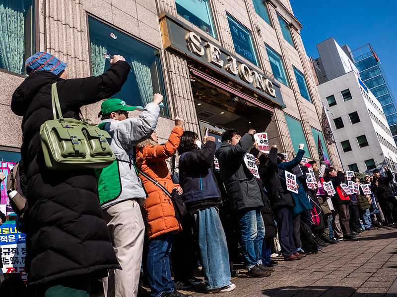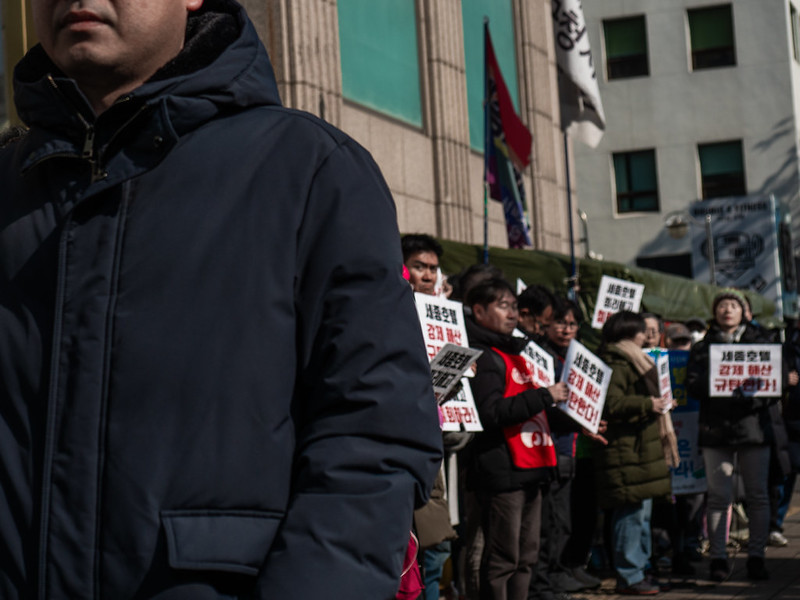 2일 오후, 세종호텔 공대위가 경찰과 사측의 농성장 침탈에 항의하고 연행자들의 석방을 촉구하는 긴급 기자회견을 호텔 앞에서 개최했다.