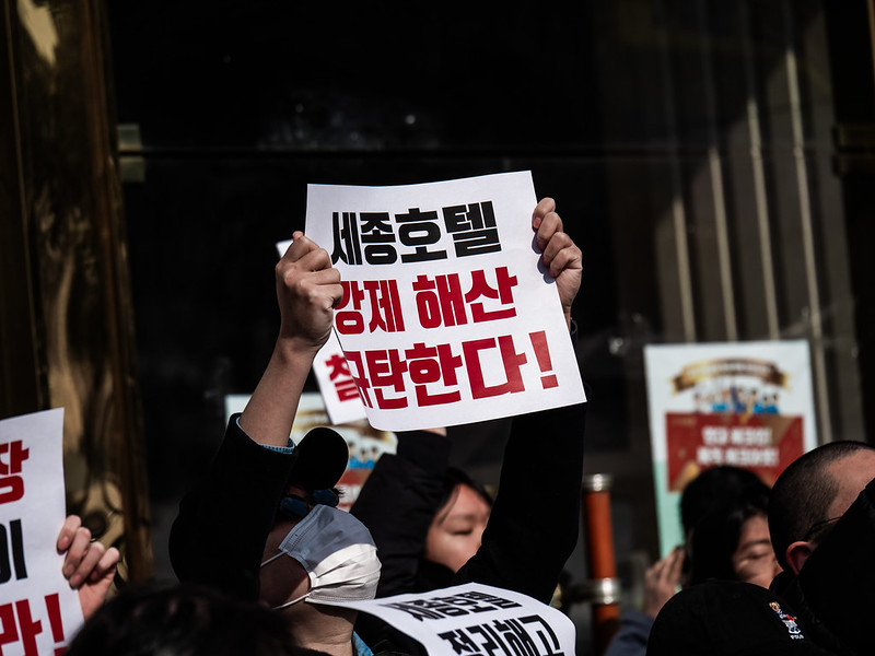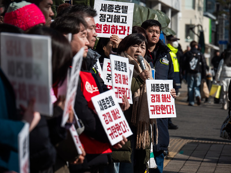 이날 오전 경찰은 해고자들의 복직과 실소유주 주명건의 교섭 참여 등을 요구하던 로비 농성장을 침탈하고, 민주노총 서비스연맹관광레저산업노조 세종호텔지부 조합원들과 연대 시민 십여 명을 강제 연행한 바 있다.