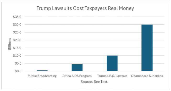 <트럼프의 소송은 납세자에게 실제 비용을 안긴다> 공영방송 (Public Broadcasting), 아프리카 에이즈 프로그램 (Africa AIDS Program), 트럼프 국세청(IRS) 소송 (Trump I.R.S. Lawsuit), 오바마케어 보조금 (Obamacare Subsidies)