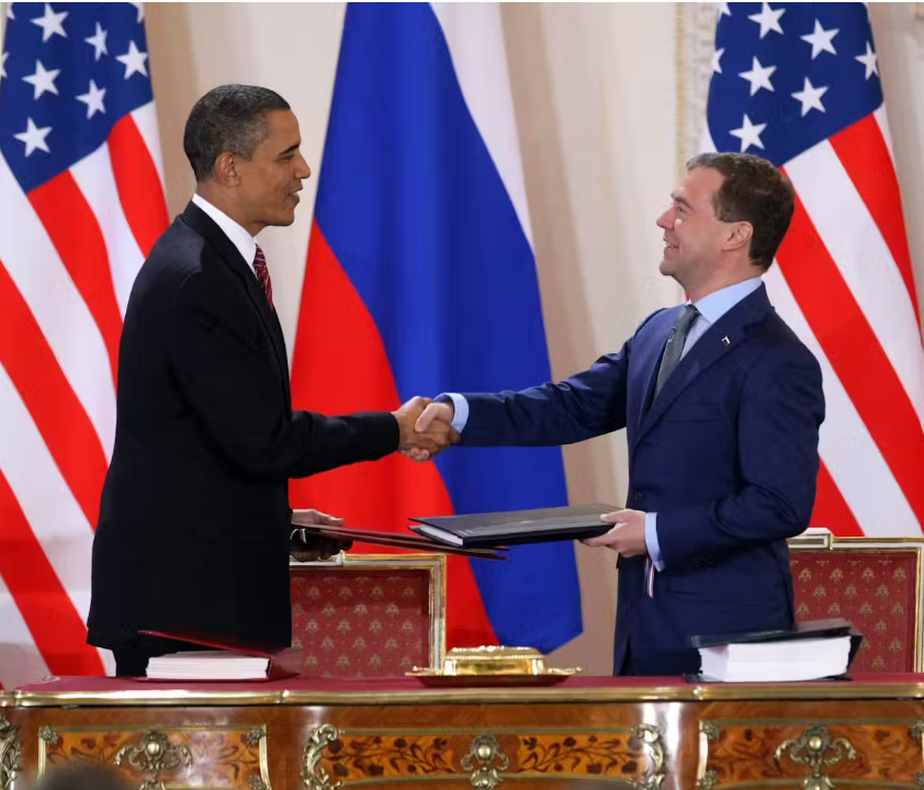 러시아 대통령 드미트리 메드베데프와 미국 대통령 버락 오바마가 2010년 프라하에서 신전략무기감축협정(New START Treaty)에 서명한 뒤 악수하고 있다