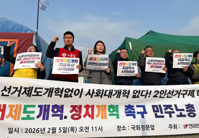 5일, 민주노총은 기자회견을 열고, 2인 선거구제 폐지와 중대선거구제 확대, 비례대표 비율 상향, 광역단체장 결선투표제 도입 등을 촉구했다.