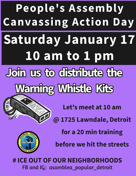 ICE에 맞서 호루라기 키트를 나누는 행사를 하는 디트로이트 인민회의의 광고