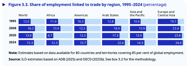 이 놀라운 자료는 국제노동기구(ILO)의 2026년판 ‘고용 및 사회 동향’(Employment and Social Trends)에서 나왔다. 이 수치는 각 지역 경제의 전체 규모와 무역 집약도의 결과다. 유라시아 경제는 거대하며, 그 무역 비중은 대규모 경제를 가진 아메리카와, 인구는 많지만 매우 빈곤한 인구를 가진 아프리카보다 더 높다. ILO는 다음과 같이 설명한다.