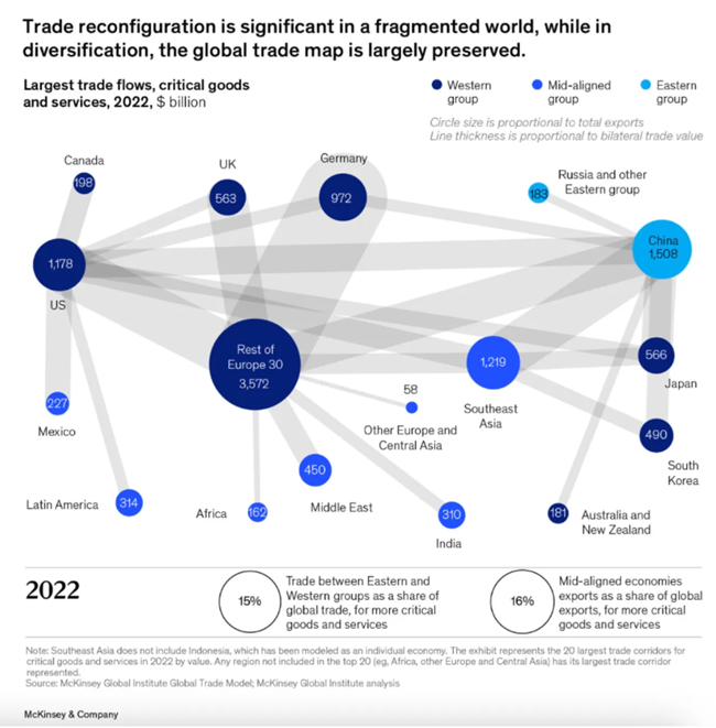 주: 동남아시아에는 개별 경제로 분류된 인도네시아를 포함하지 않는다. 이 도표는 2022년 기준 핵심 상품 및 서비스의 20대 무역 회랑을 나타낸다. 포함된 상위 20개 가운데 아프리카, 기타 유럽 및 중앙아시아의 최대 무역 회랑은 각각 하나씩이다. 출처: 맥킨지 세계무역모형(McKinsey Global Trade Model), 맥킨지 글로벌 인스티튜트 분석. 맥킨지앤드컴퍼니
